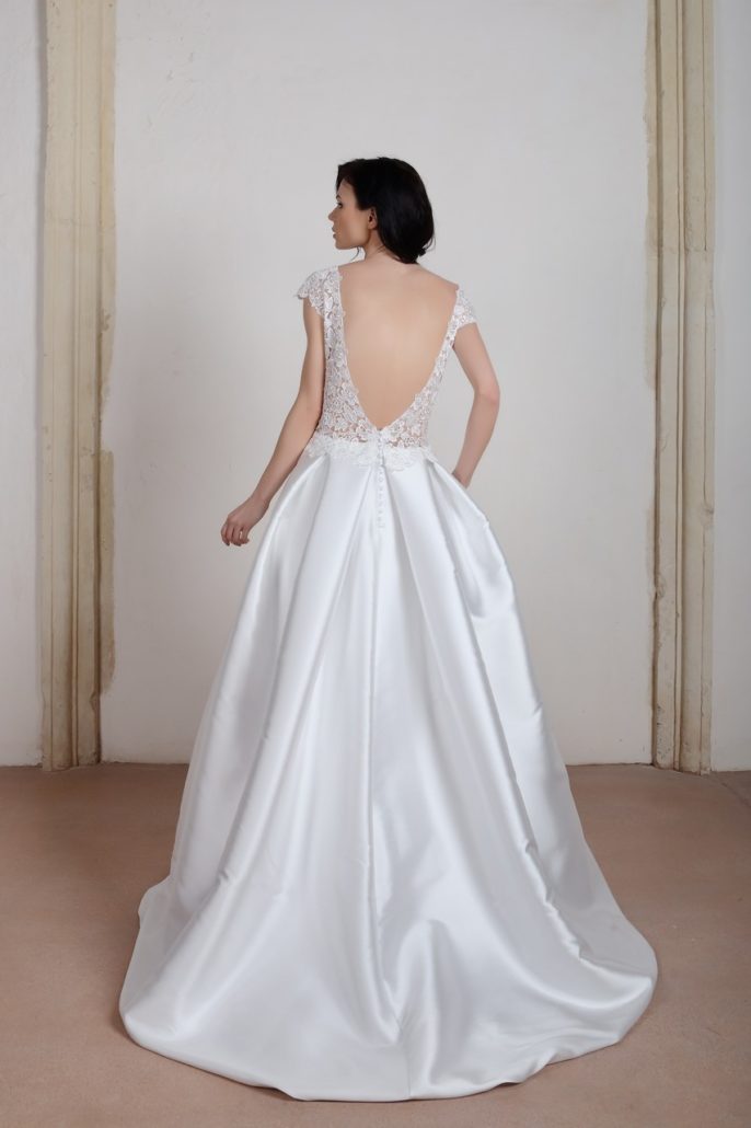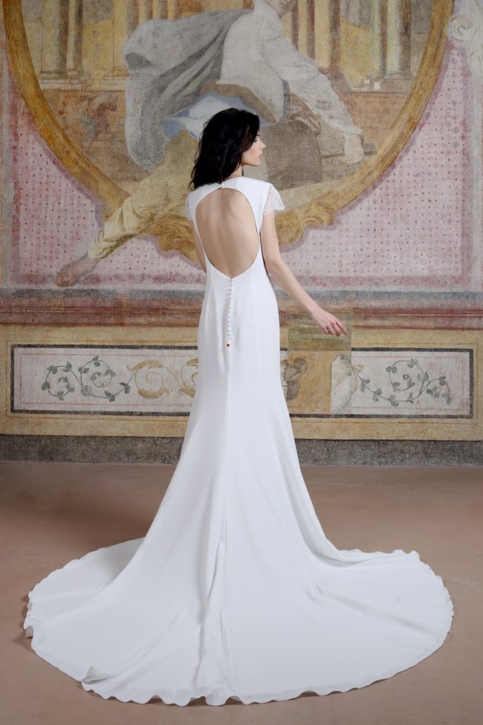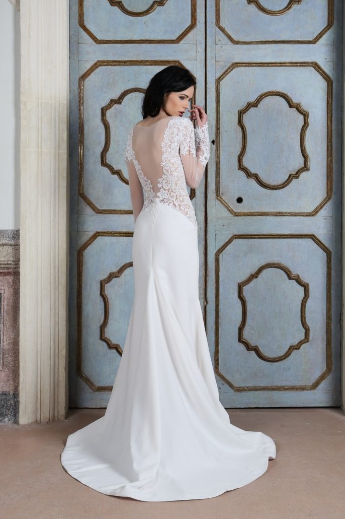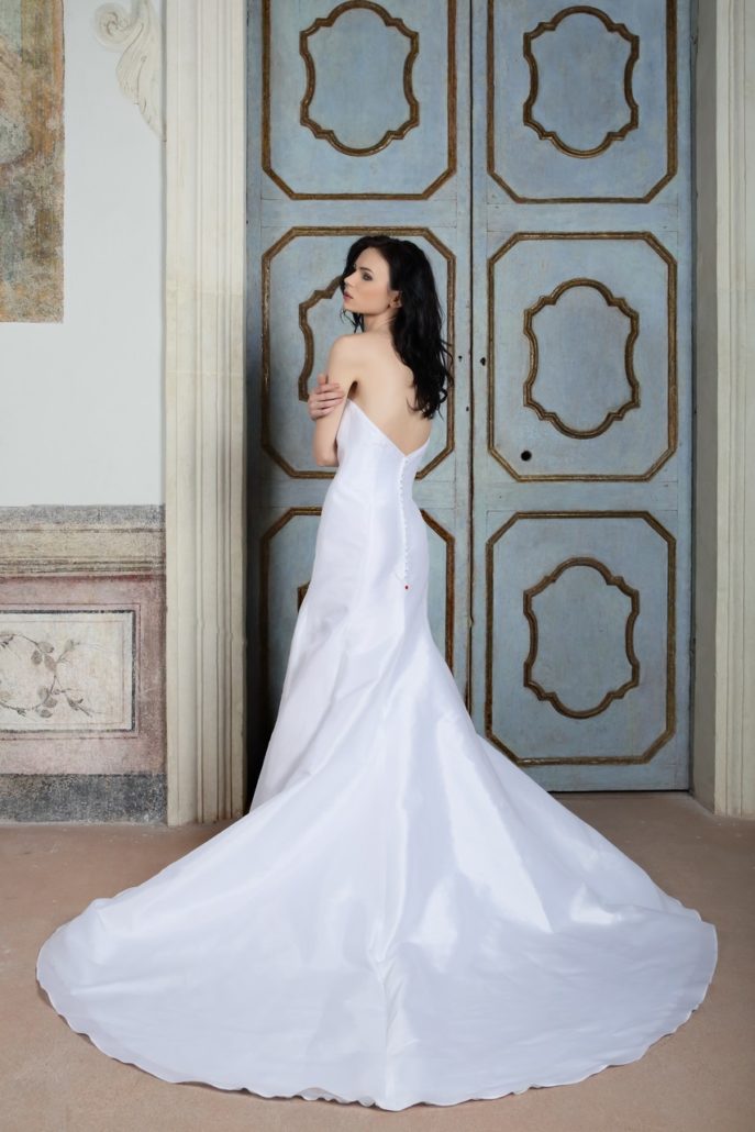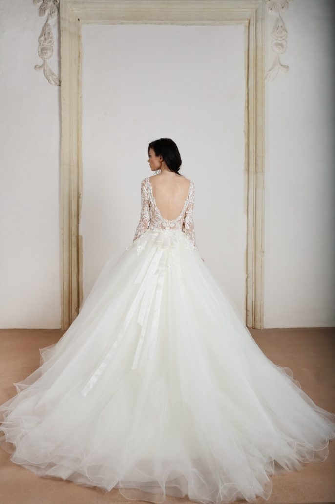 Corpini ricamati decolleté o a maniche lunghe 3/4, con gonne ampie e code lunghe sono l’espressione della rivisitazione che Elena Della Rocca fa degli abiti regali e principeschi.
