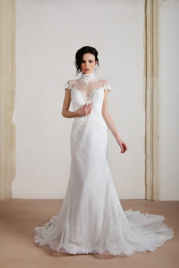 Pizzi francesi ricamati con effetto découpage su volumi sinuosi che avvolgono la figura femminile ed esaltano la sua sensualità.