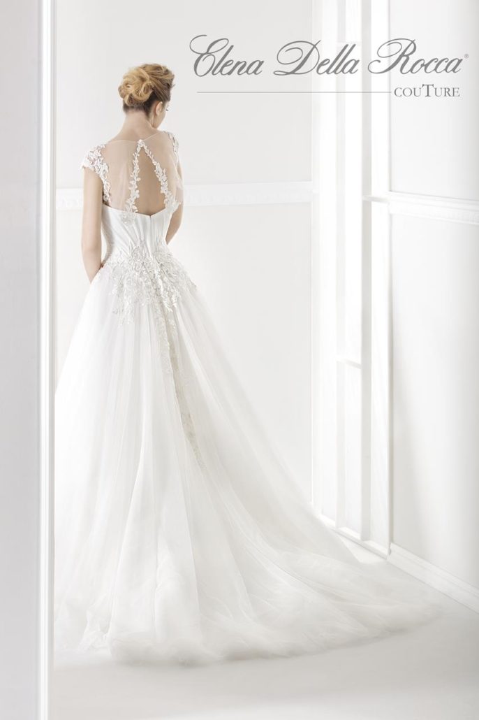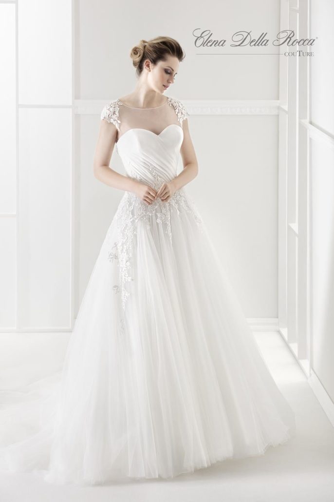 Corpino drappeggiato in diagonale in tulle fermato in vita da tralci di pizzo a rilievo che scendono anche sulla morbida gonna in tulle. Bolerino staccabile di tulle e pizzo sulla manichina e apertura.