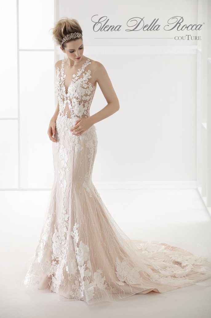 Sirena in pizzo macramè su tulle con tralci di fiori e rose bianco seta che si ramificano sia sul corpino che sulla gonna al fondo e intorno la coda. Base tessuto sotto color crema.