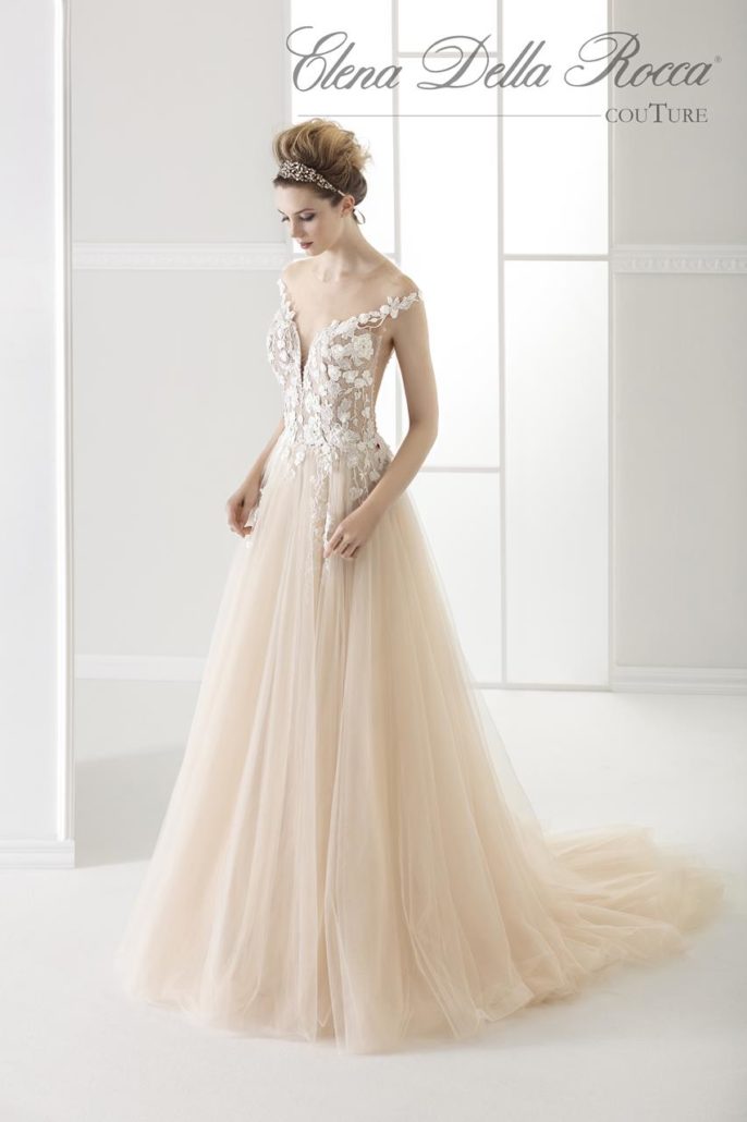 Corpino in tulle macramè a rilievo effetto 3D ricamato bianco seta su morbida gonna in tulle color crema.