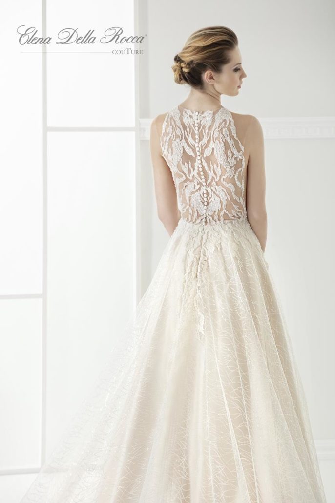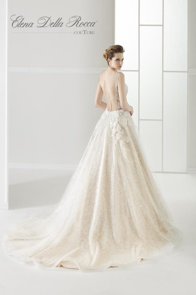 Corpino con tralci ricamati di pizzo chiaro su tessuto color cipria. Ampia gonna in tulle lavorata con micropaillettes.