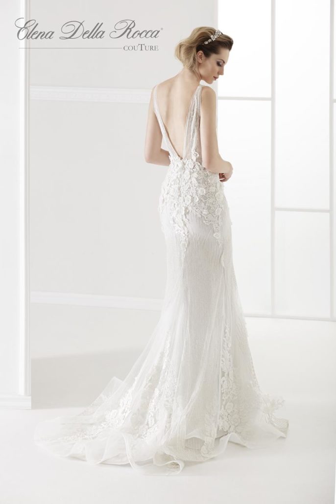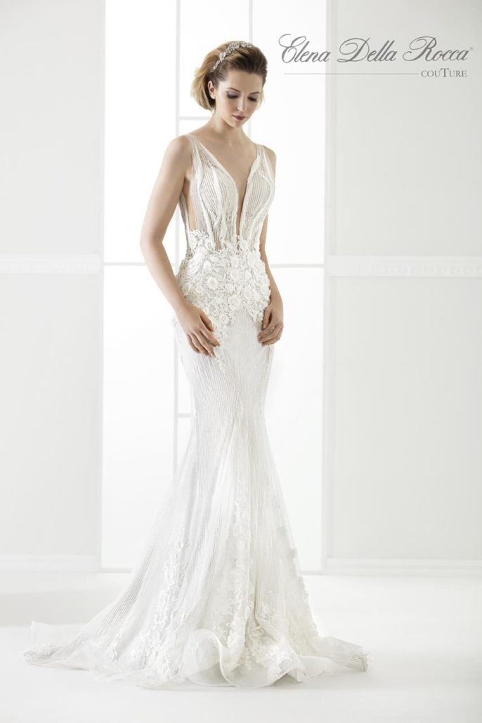 Abito a sirena con profondo scollo a V. Pizzo a righe lurex con sovrapposizioni di fiori macramè ricamati.